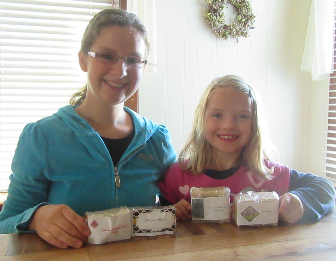 Below: Meredith and Ruthanna display the soaps prepared to sell at the Bazaar.